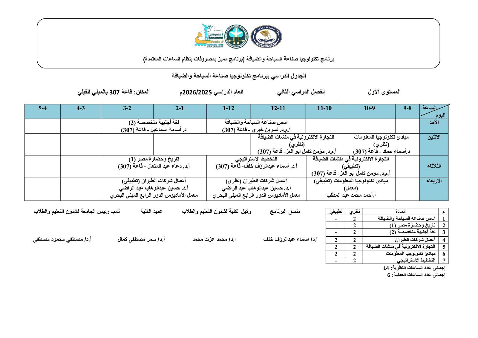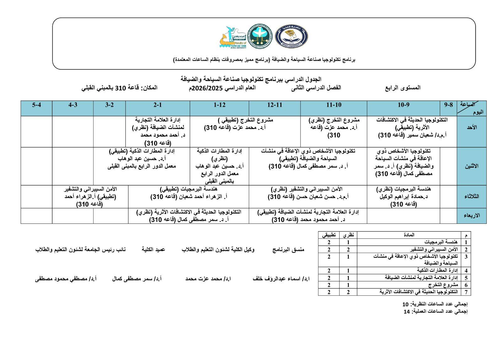 جداول برنامج صناعة السياحة والضيافة الفصل الدراسي الثاني 2025/2026